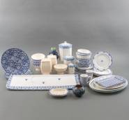 Divers gebruiksaardewerk met blauw-witte decors, schapje 65 × 15 cm