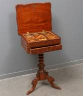 Mahoniegefineerd naaitafeltje op driespantpoot, tweede helft 19e eeuw -enkele profieltjes op hoeken en enkele schotjes voor vakverdeling ontbreken-, 58 × 50 × 42 cm