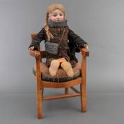 Pop met biscuit hoofd en glazen ogen, gemerkt S&C, Simon Halbig voor Franz Schmidt & Co -twee vingers met een defect-, zittend op een iepenhouten poppenstoel, pop is 73 cm lang