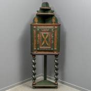 Groengeschilderde naaldhouten hoekkast met etagère en gedateerd 1773, staande op drie getorste poten, vermoedelijk Zweden, 18e eeuw, onderstel van later datum -gebruikssporen-, hoogte 194 cm