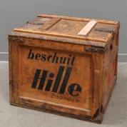 Houten beschuitkist met messing binnenkant, voorzien van inscriptie: beschuit Hille Zaandam -één van de twee sluitingen incompleet-, 46 × 55 × 58 cm