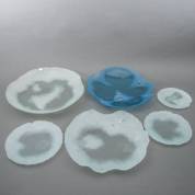 Frank van den Ham (1952), nest van zes deels gesatineerd glazen schalen met vrij gevormde randen, één van lichtblauw glas, Ø grootste 47 cm