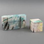 Helmi Schellinger (1944-2023), twee rakugestookte keramische objecten: dekseldoosje uit drie delen en scharnierende dekseldoos, gemerkt, 14 × 24 × 6 cm