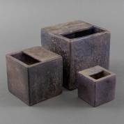 Serie van drie keramische blokvaasjes met rechthoekige opening, alle uitvoering Mobach, Utrecht, jaren '60-'70, grootste 14 × 13,5 × 13,5