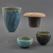 Bert Kramp (1953), een rakugestookt kommetje en een blauwgeglazuurd vaasje, daarbij twee andere vaasjes met eveneens signatuur 'B', mogelijk van Han Boerrigter, jaren '80, 18 × Ø 13 cm