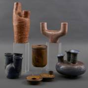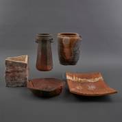 Vijf grove keramische vormstukken, onduidelijk gesigneerd, enkele mogelijk La Borne, Frankrijk, jaren '80 -lichte gebruikssporen-, 26 × 15 cm