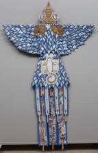 Rudi Corens (1933-2020), vogel, wanddecoratie van batik veren en staart met decoratie van kaurischelpen, gehamerd metaal, en touw -metaal iets gecorrodeerd, textiel verkleurd-, 185 × 117 cm