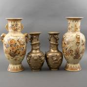 Twee grote Chinees porseleinen vazen met vogel- en bloemdecor, 58 × Ø 30 cm, daarbij: twee Chinese messing vazen met drakendecor, beide modern