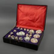 Japans theeserviesje bestaande uit twaalf kop-en-schotels, theepot, roomkannetje en suikerpot, 20e eeuw, in kist -gebruikssporen, één kop-en-schotel defect, andere met haarlijn-, maat kist 15 × 55 × 42,5 cm