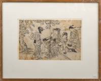 Toegeschreven aan Nishikawa Sukenobu (1670-1751), vier figuren bij een boom met brief, boekillustratie, Japanse houtblokdruk -verkleuring en vervuiling-, 20 × 32 cm