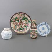 Vier stuks Chinees porselein: gemberpot, schotel, vaas en bord, 18e-20e eeuw -enkele defecten-, schotel Ø 37,5 cm