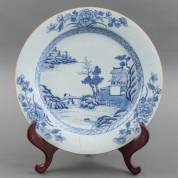 Chinees porseleinen schotel met blauw-wit waterlandschapsdecor, Qianlong -gebroken en gelijmd, hoekje gerestaureerd-, Ø 38 cm