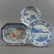 Rechthoekige Chinees porseleinen famille rose dienschaal met figurendecor, schotel met blauw-wit landschapsdecor, en diep dubbelbord met pagodedecor, Qianlong -alle gelijmd-, afmetingen dienschaal 29 × 38 cm