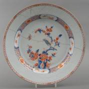 Grote Chinees porseleinen Imari schotel, het decor met vogel op bloesemtak, vroeg Qianlong, circa 1730-1740 -bord doormidden en andere restauraties-, Ø 42,2 cm