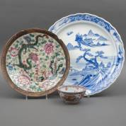 Drie stuks Aziatisch porselein: Amsterdams bont kom, 18e eeuw, Chinese Nanking schotel -randchips-, en grote Japanse blauw-witte wandschotel, circa 1900, Ø 47 cm