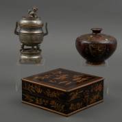 Lakwerk doos met bladerdecor, cloisonné vaasje, en tinnen wierookbrander -defecten-, doos 8 × 20 × 20 cm