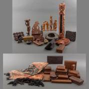Indonesische souvenirs: gestoken houten doosjes, gesneden houten wanddecoratie in de vorm van een Balinese schone, batikstempels, twee halve ikat doeken, Sumba, etc. -kleine defecten-, diverse afmetingen