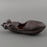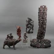 Vier Aziatische houtsnijwerken: vissers, landarbeiders, en zotjes op de rug van een buffel, daarbij: Afrikaans houten beeld, 20e eeuw -defecten-, 84 × 20 × 6 cm