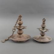 Twee metalen olielampen, 20e eeuw, India -kleine defecten-, grootste lamp zonder ketting 28 × Ø 23 cm