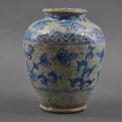 Perzische keramiek vaas met blauw-wit decor, Qajar, 19e eeuw -gebruikte staat-, hoogte 26 cm