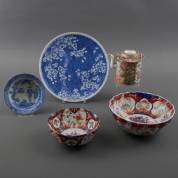 Chinees porseleinen schotel met blauw-wit prunusdecor, Kangxi gemerkt, 19e eeuw, twee Japans Imari kommen met bloemdecor, Japans porseleinen klapmutskom met blauw-wit decor van westerling met bediende, en Chinees porseleinen theepot met famille rose decor, Kanton -kleine defecten-, schotel Ø 30,5 cm