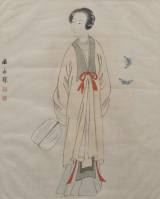 Wan Wing Sum (Wen Yongchen, 1922-1995), geisha met waaier en vlinders, kleur op zijde, gemonogrammeerd, 25,5 × 20,5 cm