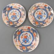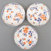 Drie Chinees porseleinen Imari schoteltjes met bloemdecor, 18e eeuw -één gelijmd-, Ø 14 cm