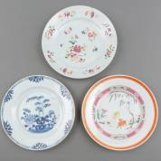 Drie diverse Chinees porseleinen borden: een met famille rose hertendecor, een met famille rose bloemdecor, en de laatste met blauw-wit tuinendecor, alle 18e eeuw, grootste Ø 22,8 cm -enkele chipjes-