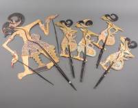 Vijf wayang kulit poppen, Indonesië, 20e eeuw, grootste 97 cm hoog