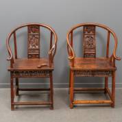 Twee Chinese 'horseshoe' stoelen met gesneden rugleuning, tweede helft 20e eeuw -één met defecte armleuning, stukje aanwezig- 99 × 60 × 67 cm