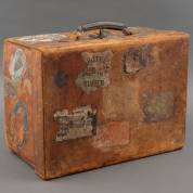 Oude bruin lederen reiskoffer met diverse papieren labels, het interieur met zalmroze fluweel bekleed -gebruikte staat-, 28 × 47,5 × 39 cm