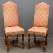 Paar noten stoelen met gedraaide poten en voluutvormige regels, de rug en zitting bekleed met zalmroze satijnen met granaatappelmotief, Louis Quatorze, Duitsland, circa 1725/1730, herkomst: slot Reichmannsdorf tot 1998, 122 × 50 × 50 cm