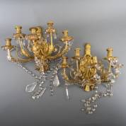 Paar verguld metalen vijflichts wandlusters met pegels, Frankrijk, eerste helft 19e eeuw -enkele missende pegels-, 37 × 50 × 30 cm