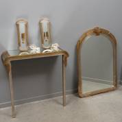 Zilver- en goudgeschilderde consoletafel met spiegelblad, spiegel en paar wandlampen, art deco-stijl, België, modern, tafel 84 × 85 × 30 cm, spiegel 108 × 74 cm