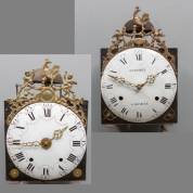 Twee haantjescomtoises met bolle wijzerplaten, één gesigneerd Boissieu à Romans, circa 1800, met slingers en gewichten -één gewicht zonder ophangoog-, 37 × 24 ×17 cm
