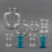 Drie staalblauwglazen vazen, ontwerp 7, uitvoering Glasfabriek Leerdam, vanaf 1947, gemerkt -krasjes-, daarbij: drie blanke glazen en twee blauwe glazen 'Diabolo' vazen, ontwerp Jan van der Vaart, uitvoering Glasfabriek Leerdam, 1994 -grote vaas een beetje aanslag-