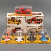 Negen metalen en kunststof modelauto's, diverse schalen, uitvoering Politoys, enkele met originele verpakking, Italië, jaren '60/'70