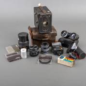 Diverse cameraonderdelen, waaronder twee lenzen, en een Zeiss-Ikon Box-tengor camera