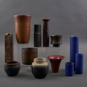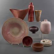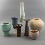 Zeven keramische objecten waaronder een dekselvaas (het deksel is los van de vaas gefotografeerd), voornamelijk jaren '80-'90 -gebruikssporen-