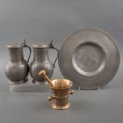 Twee tinnen klepkannen en een kardinaalsbord, daarbij: messing knopvijzel met stamper, 19e eeuw -gebruikssporen, restauraties-, Ø 39 cm