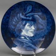 Delfts aardewerk schotel met blauw-wit decor naar Rembrandt: 'Zelfportret', uitvoering Oud Delft, midden 20e eeuw -chip in standring opgevuld, craquelé aan achterzijde- Ø 37,5 cm