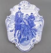 Aardewerk plaquette met blauw-wit transferdecor: vrouw in paardenslee, circa 1900, 45 × 32,5 cm