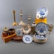 Divers kleingoed, waaronder: voorraadblik, paar verzilverde kandelaars -doorgepoetst-, Oranjegezinde aardewerk borden, schildpad doosje -defect- en houten kistje