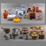 Divers kleingoed, waaronder: koper, tin, laboratoriumglas en blauw-wit aardewerk