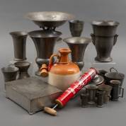 Gehamerde tinnen sigarendoos, tazza, diverse vazen, kleine maatbekers, blikken gifspuit, en keramische kruik gevuld met whiskey -tazza beetje scheef en gedeukt-, vaas: 17,5 cm