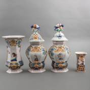 Driedelig aardewerk kaststel en vaasje met Delfts decor van de Prins en Prinses van Oranje, Engeland, 19e eeuw -valse keuren, vele defecten en restauraties-, grootste vaas 29 × 19 × 13 cm
