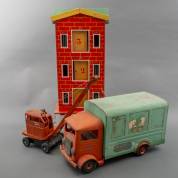 Speelgoed: blikken vrachtwagen en kraan, beide uitvoering Tri-ang, Engeland, en houten pakhuis, hoogte pakhuis 52 cm