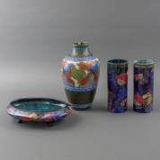 Divers kleingoed, waaronder: koperen kruik, geslepen glazen punchbowl, cloisonné schaal, aardewerk schaal, uitvoering Eddy Varekamp, en paar tinnen kandelaars