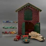 Beschilderd houten pakhuis, en diverse metalen speelgoedauto's, waaronder uitvoering Tootsietoys en Hubley, 57 × 44 × 39 cm