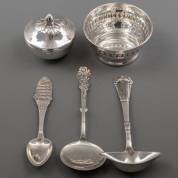 3e gehalte zilveren petit-fourlepel met gestileerde steel, 1918, 3e gehalte zilveren lepel met decor van een klipper en onderschrift: 'Jul 31', meester: Aug. Thomsen, 1931, daarbij: drie verzilverde objecten, alle Denemarken, lengte petit-fourlepel 20 cm